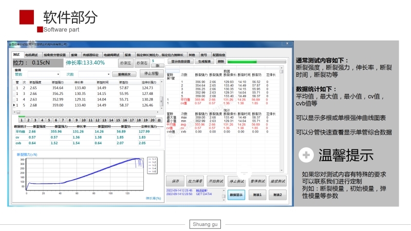 14、測(cè)試數(shù)據(jù)輸出方式:輸出數(shù)據(jù)包括:斷裂強(qiáng)力、斷裂伸長(zhǎng)率、斷裂強(qiáng)度、斷裂時(shí)間、斷裂功、定強(qiáng)力伸長(zhǎng)、定伸長(zhǎng)強(qiáng)力以及數(shù)據(jù)統(tǒng)計(jì)中的最大值、最小值、平均值、CV值(可以根據(jù)客戶要求量身定制)